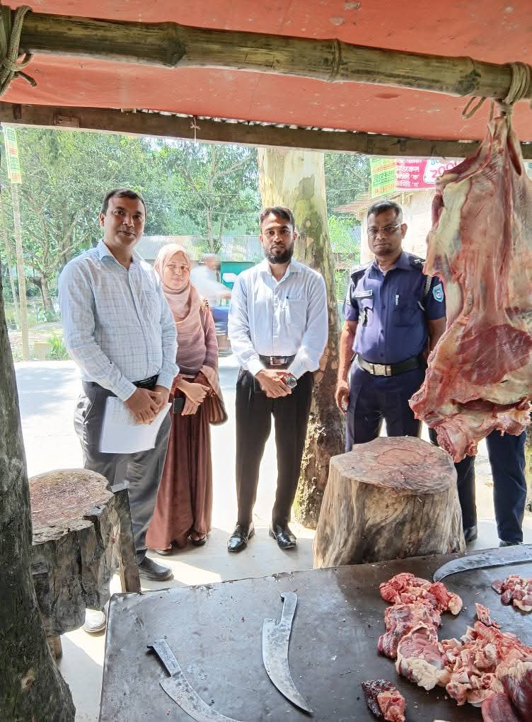 এই অভিযানে উপস্থিত ছিলেন উপজেলা প্রাণিসম্পদ কর্মকর্তা, ডা. মোঃ রহমত আলী, ভেটেরিনারি সার্জন, মোছাঃ রনজিনা আক্তার। পরিদর্শনের মূল উদ্দেশ্য ছিল পশু জবাইখানার পরিবেশ ও মাংসের গুণগত মান যাচাই করা। মাংস যেন সম্পূর্ণ স্বাস্থ্যসম্মত থাকে, সে বিষয়ে প্রয়োজনীয় পরামর্শ ও নির্দেশনা দেওয়া হয়েছে।
